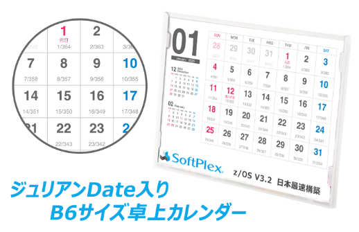 この度SoftPlexでは、2026年版「ジュリアンDate入り卓上カレンダー」を製作しました。「ジュリアンDate」は、日付の管理や計算の際に大変重要な要素となります。手元に置いて、いつでも「ジュリアンDate」を参照できるカレンダーとして、メインフレームに携わる方へ少しでもお役にたてることを願っております。
